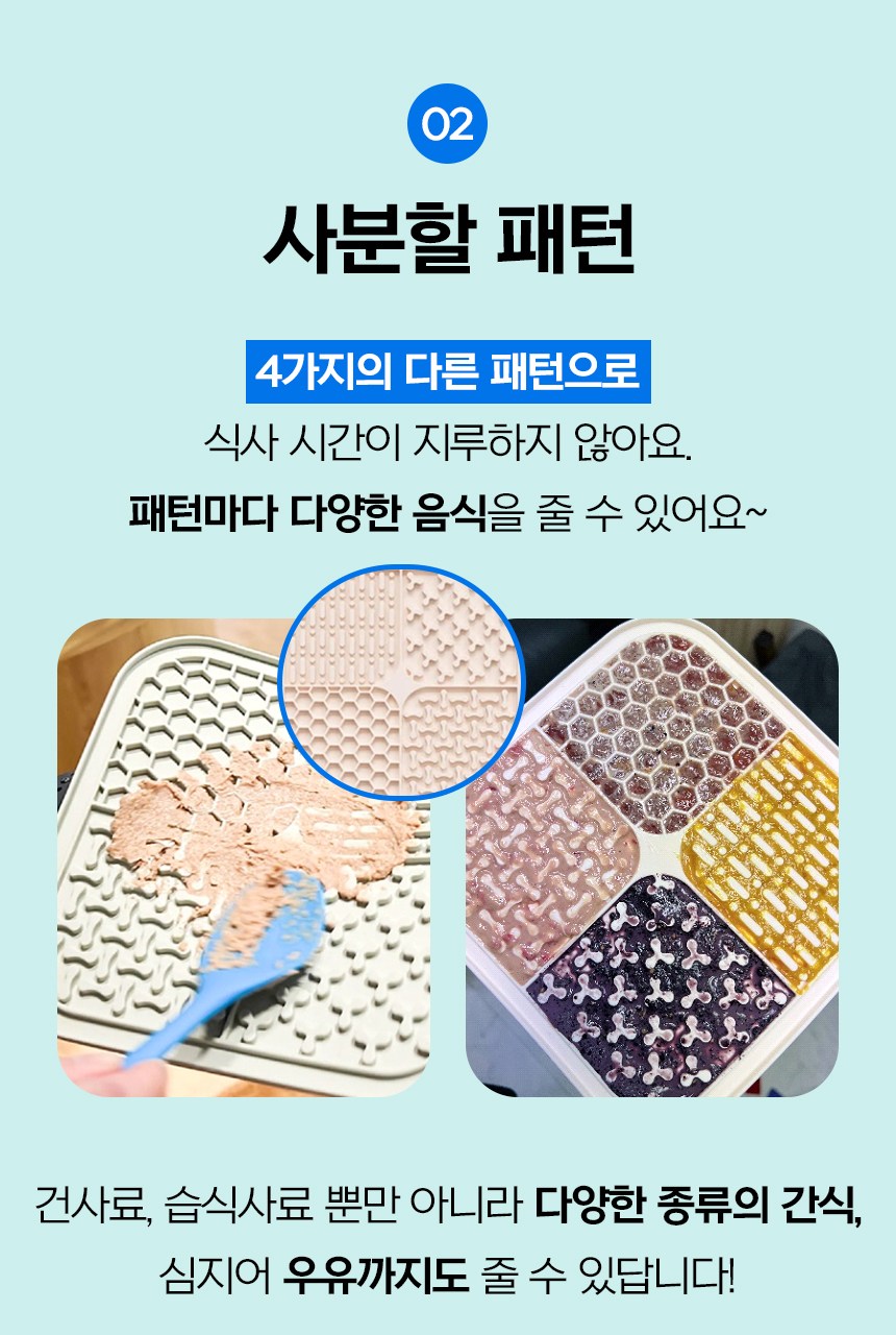 - 這款寵物舔食墊有多種紋路設計,讓毛孩在舔食過程中享受不同的樂趣,增加用餐時的趣味性。