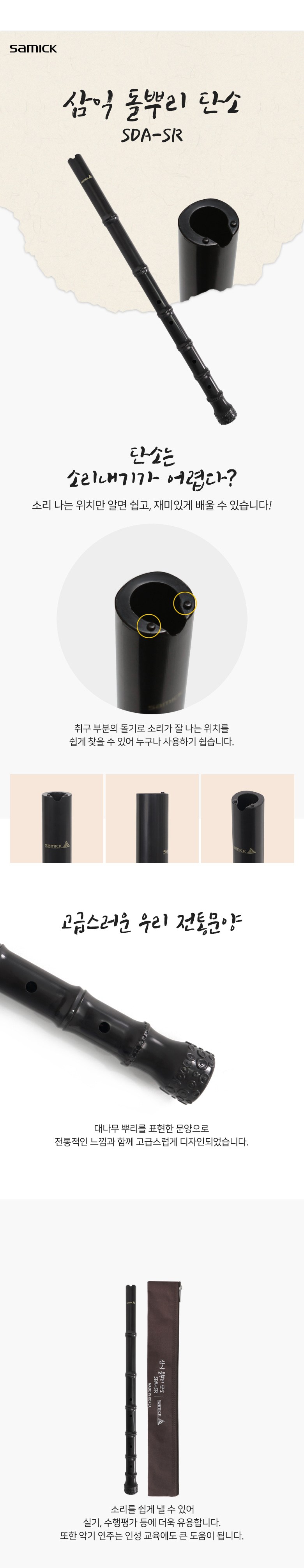 三益石根短簫SDA-SR是一款容易發聲的韓國傳統管樂器,特別設計的吹口突起部分,能幫助使用者輕鬆找到正確的發聲位置,即使是初學者也能快速上手。此款短簫以竹根為靈感的圖案設計,融合了傳統美感與現代設計,外觀精緻。韓國製造確保了樂器的品質與音準,不僅適合術科教學與評量,更能培養使用者的品格與音樂素養。產品通過兒童產品安全認證,讓您使用。配件包含短簫、簫套和指法表,方便學習與攜帶。