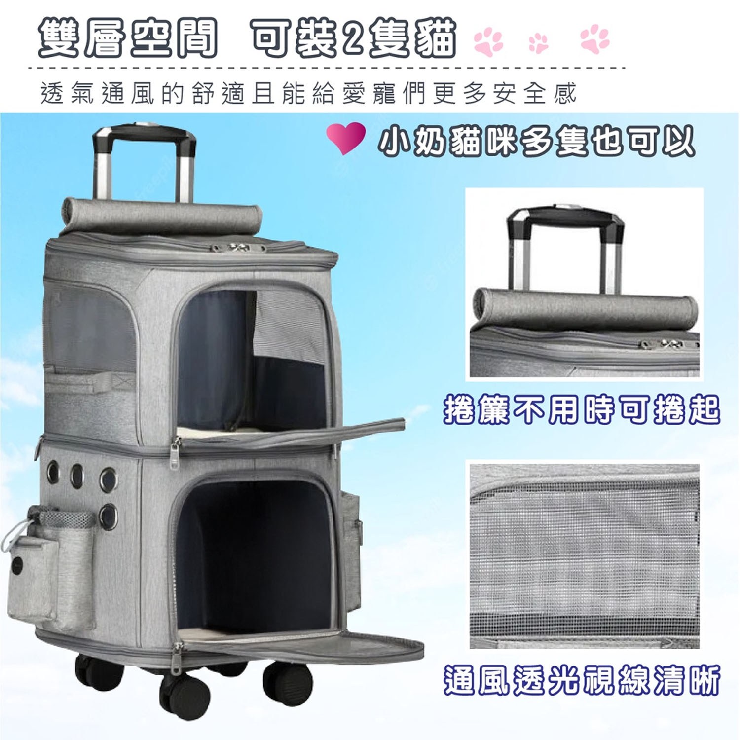 - 雙層設計,一次可攜帶兩隻寵物,讓您的愛寵們一同享受外出時光。