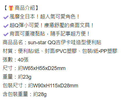 這款QQ吉伊卡哇造型便利貼,是風靡日本的超人氣可愛角色周邊商品!小可愛造型設計,Q彈療癒,為您的桌面增添一抹趣味。每本包含40張可重複黏貼的便利貼,方便您隨手記錄重要事項。尺寸為65 x 55 x 25mm,輕巧便攜,無論是在辦公室、學校或家中,都能隨時使用。讓可愛的吉伊卡哇陪伴您,記錄生活中的點滴!