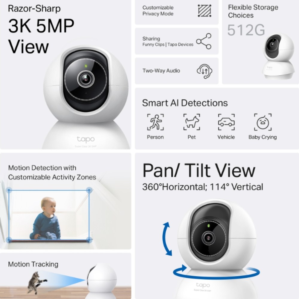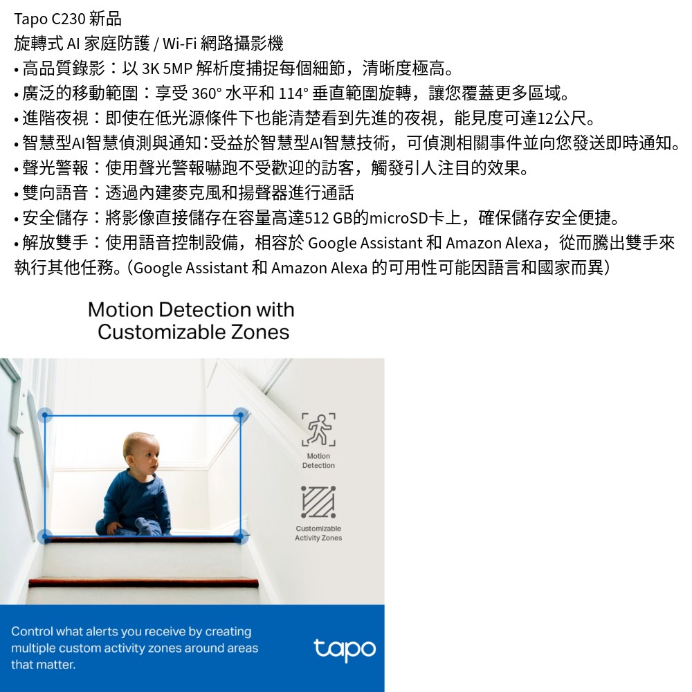 - 使用3K超高解析度,Tapo C230網路攝影機讓您在家中也能捕捉到每個清晰細節,畫面生動逼真。
