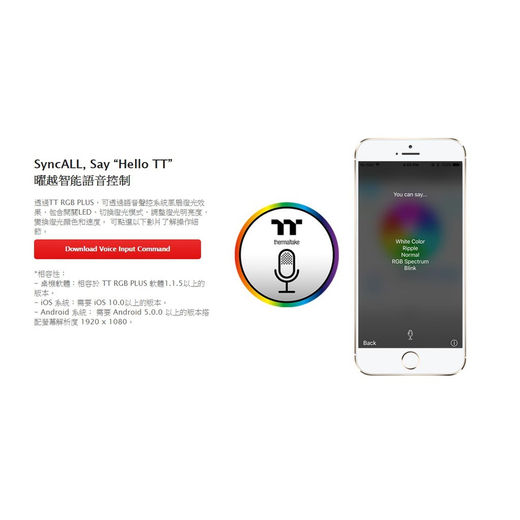 - 透過Riing Plus軟體,客製化風扇的RGB燈光效果,讓您的電腦更具個性化。
