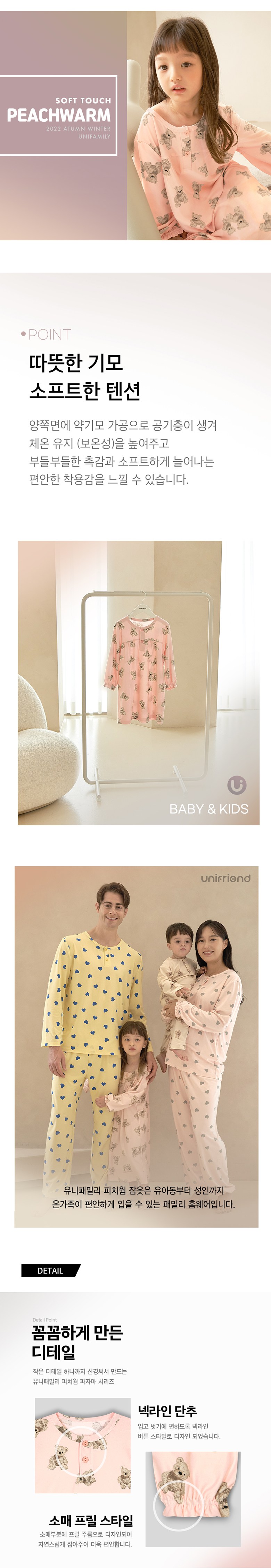 Unifriend童款蜜桃小熊保暖連身睡衣裙,採用柔軟的蜜桃絨材質,觸感輕柔舒適,給孩子們帶來溫暖呵護。可愛的小熊造型設計,增添童趣,讓孩子們愛不釋手。連身裙的設計,保暖性更佳,讓孩子們在寒冷的天氣也能溫暖舒適地活動。領口鈕扣設計方便穿脫,袖口荷葉邊款式增添甜美感。Unifriend Peachwarm睡衣是全家人都可以舒適穿著的家庭家居服,讓孩子們在溫暖舒適的環境中健康成長。