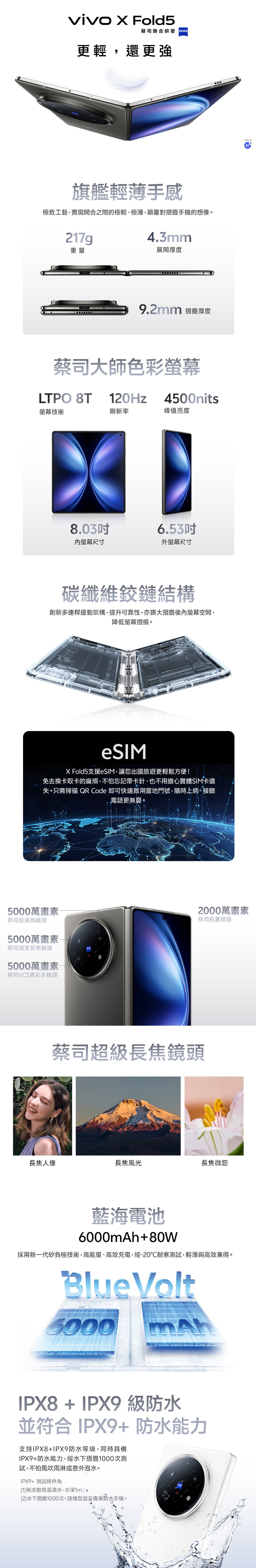 vivo X Fold5是一款蔡司聯合研發的旗艦摺疊手機,以極致工藝實現輕薄手感,顛覆您對摺疊手機的想像。展開厚度僅4.3mm,摺疊後9.2mm,重量僅217g,攜帶無負擔。配備蔡司大師色彩螢幕,採用LTPO 8T 120Hz技術,提供極致流暢的視覺體驗。搭載6000mAh藍海電池,支援80W快速充電,讓您隨時保持電力充沛。IPX8+IPX9級防水能力,讓您使用更安心。