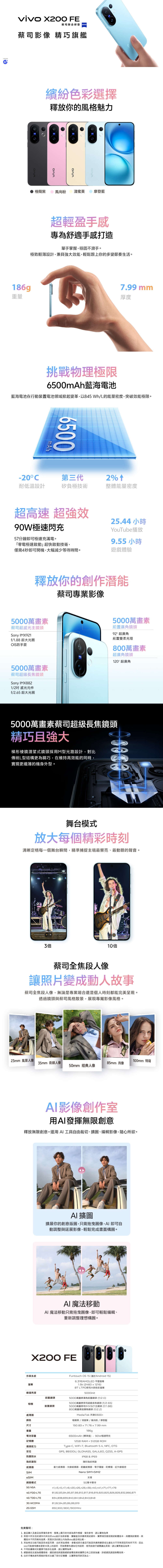 - 搭載聯發科天璣9300+處理器,vivo X200 FE提供卓越效能,無論是遊戲或多工處理都能流暢運行。