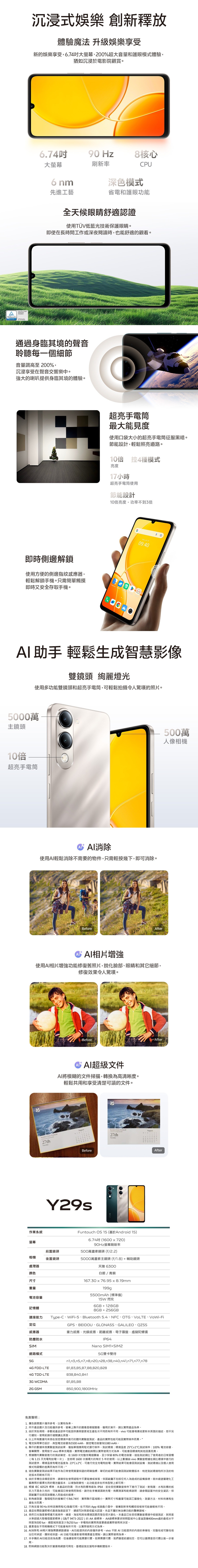 vivo Y29s 5G手機擁有6.74吋大螢幕,提供沉浸式的視覺體驗,讓您享受更寬廣的視野。白銀色外觀設計時尚優雅,展現個人獨特品味。搭載5G高速網路,讓您隨時隨地暢享快速連接。6GB記憶體確保手機運行流暢,128GB儲存空間讓您盡情儲存照片和影片。原廠保固提供安心保障,讓您使用更放心。