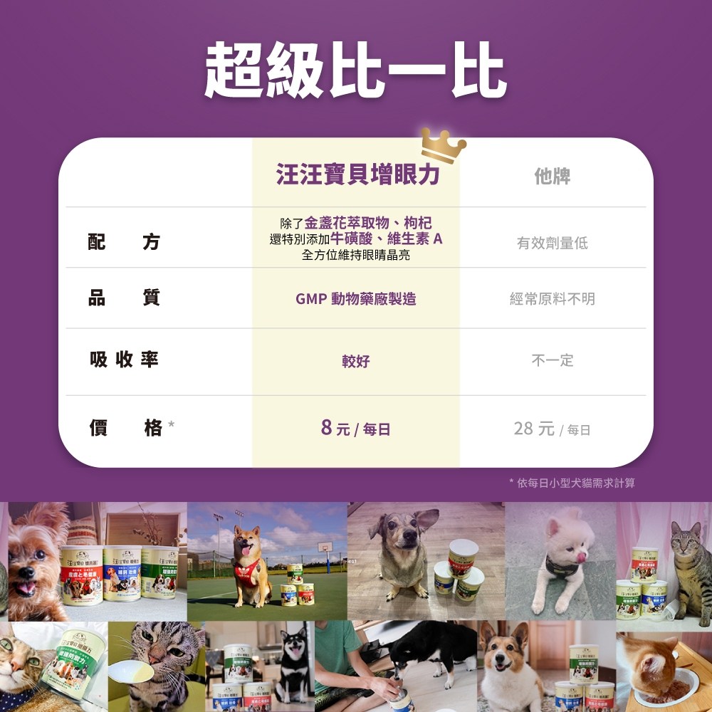 汪汪寶貝增眼力是一款專為老年犬貓及眼睛不適的寵物設計的營養補充品。本產品富含金盞花萃取物(含葉黃素)、牛磺酸、枸杞和維生素A,有助於維護寵物的眼睛健康,保持視力清晰明亮。每日補充,能有效舒緩眼睛疲勞,為愛寵提供全面的眼睛保健。350g罐裝,粉末狀,方便餵食,讓您的愛寵擁有明亮的雙眼,享受健康快樂的生活。